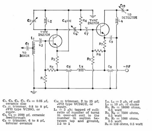 Este circuito se utiliza en receptores super-heterodinos de VHF y UHF. El circuito es del manual de transistores de la RCA de 1964. Los transistores equivalentes como los BF495 pueden ser utilizados.