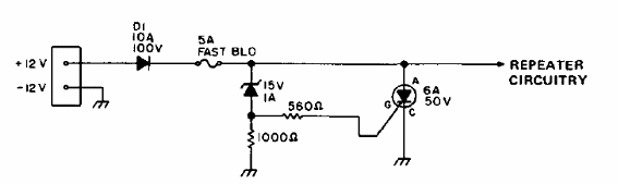 Cuando la tensión en este circuito sobrepasa el valor zener, el SCR dispara quemando el fusible de acción rápida. El circuito está indicado para la protección de circuitos repetidores que se ha encontrado en una documentación de Telecom de 1977. El SCR puede ser el TIC106 para fusibles hasta 2 A.