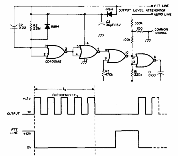 Este circuito fue encontrado en una publicación para radioaficionados de 1973. Genera salvavidas de 1800 Hz con una duración de 1 segundo para sistemas de llamada. El circuito se conecta en la llave que activa el micrófono de un radiotransmisor.