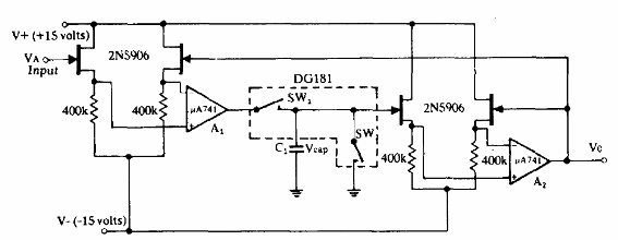 Este circuito es de una publicación de Siliconix de 1975. El circuito es del tipo no inversor, haciendo uso de FET que pueden ser los BF245. El circuito hace uso de llaves analógicas que pueden ser obtenidas de funciones CMOS como el 4066.