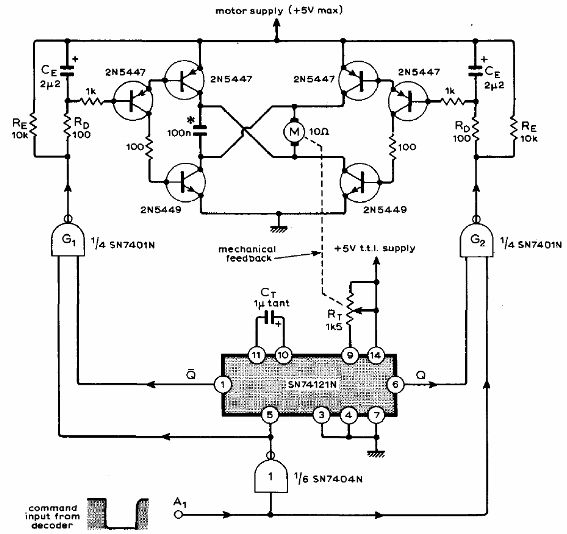 Este circuito fue encontrado en el "Servo Motor Drive Ampliiers" de Motorola de 1972. Los transistores de potencia pueden ser los BD135 y BD136 para motores hasta 500 mA y los drivers pueden ser los BC548 y BC558. El circuito TTL debe ser alimentado con 5 V y el driver del motor con la tensión nominal del servo.