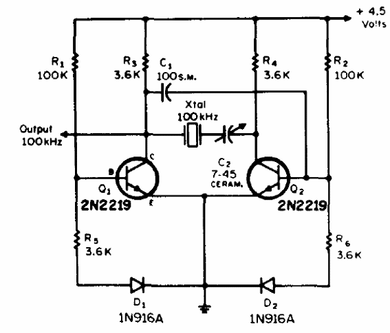 Encontramos este circuito en una revista CQ para radioaficionados de 1972. Los transistores pueden ser los 2N2222 y la frecuencia del circuito es dada por el cristal.