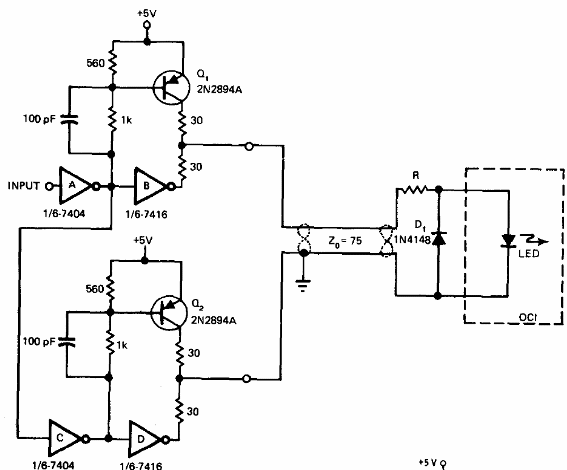 Este circuito tiene por finalidad alimentar a los LED a través de cables coaxiales de 75 ohms, sin interferir en el envío de señales. El circuito es de una documentación de 1976, siendo implementado con lógica TTL. El circuito debe ser alimentado por una tensión de 5 V.