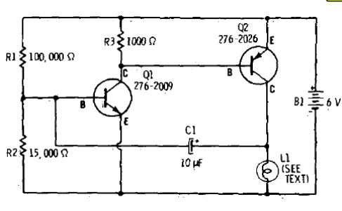 Este parpadeo de configuración bastante conocido fue sugerido por una publicación de Radio Shack de 1977. La frecuencia depende del condensador. Para Q2 como BD136, la lámpara puede tener hasta 200 mA de corriente. El otro transistor puede ser el BC548. La alimentación se puede hacer con tensiones de 6 a 12 V según la lámpara.