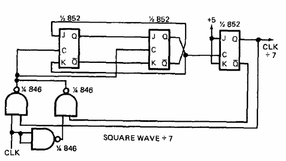 Este circuito muestra cómo utilizar funciones lógicas comunes para dividir una frecuencia por 7. La señal de salida es cuadrada y los circuitos integrados de cualquier lógica pueden ser utilizados. Podemos utilizar el circuito como shield para microcontroladores.
