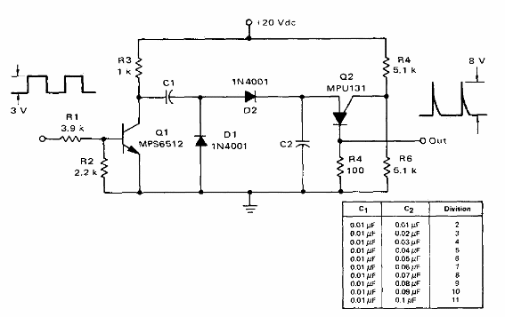 Este circuito fue obtenido en una publicación sobre PUT (Transistor programable Unijunción) de Motorola de 1974. El circuito divide señales rectangulares en frecuencias que dependen de los componentes dados en la tabla junto al diagrama.