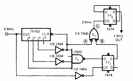 Hemos encontrado este circuito en una documentación técnica de 1972. El circuito es TTL con una frecuencia de entrada de hasta 5 MHz y una salida de 1 MHz. La alimentación debe realizarse con tensiones de 5 V.