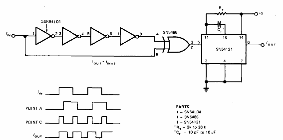 Este circuito fue encontrado en una revista americana de 1976. Se dobla la frecuencia de señales TTL en la pista indicada. El circuito debe ser alimentado por 5 V y los valores de los componentes dependen de la frecuencia.