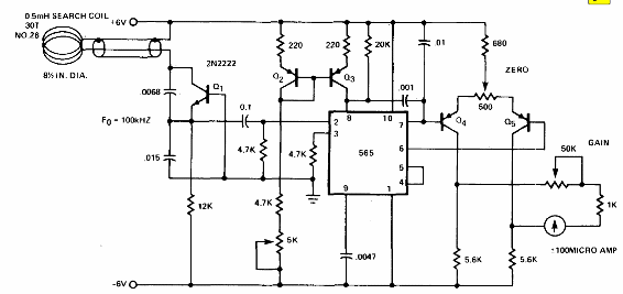 Encontramos este circuito en un manual de circuitos integrados de Signetics. El circuito detecta cualquier tipo de metal. Los transistores PNP no indicados pueden ser los BC558. La bobina consiste en 30 espiras de hilo 28 en una forma de plástico de 30 a 40 cm de diámetro.