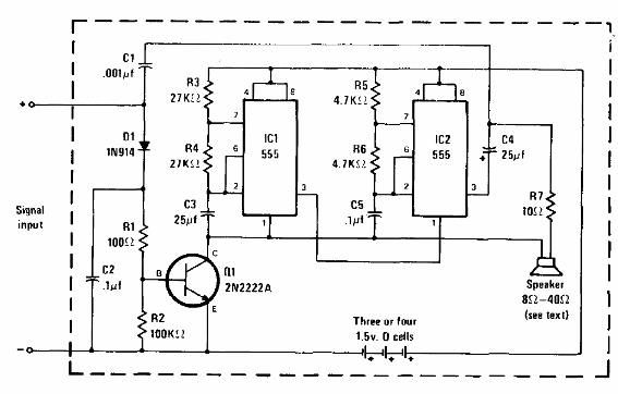 Este circuito originalmente fue recomendado para dar la señal de llamada en intercomunicadores. Sin embargo, se puede utilizar con otras aplicaciones. El circuito es de una documentación de 1978. El transistor puede ser el BC548.