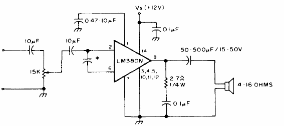 Encontramos este circuito en una documentación de 1977. El LM380 de National Semiconductor ya no se encuentra fácilmente, pero si se usa en este amplificador proporciona una excelente calidad de reproducción.