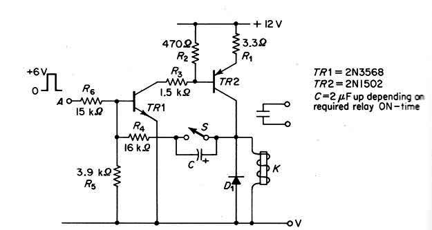 Este sofisticado control temporizado de relés se ha encontrado en documentos de 1968. El circuito controla un relé con varios tipos de señales producidas por las teclas. La fuente de alimentación es de 12 V, de acuerdo con los tipos de relé utilizados.