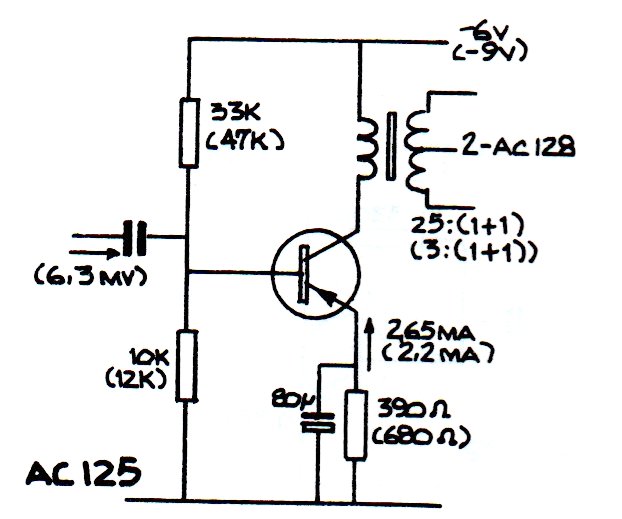 Este circuito fue encontrado en una documentación de 1985. El transistor es de tipo antiguo de germanio y la carga es un transformador con alta impedancia de entrada.