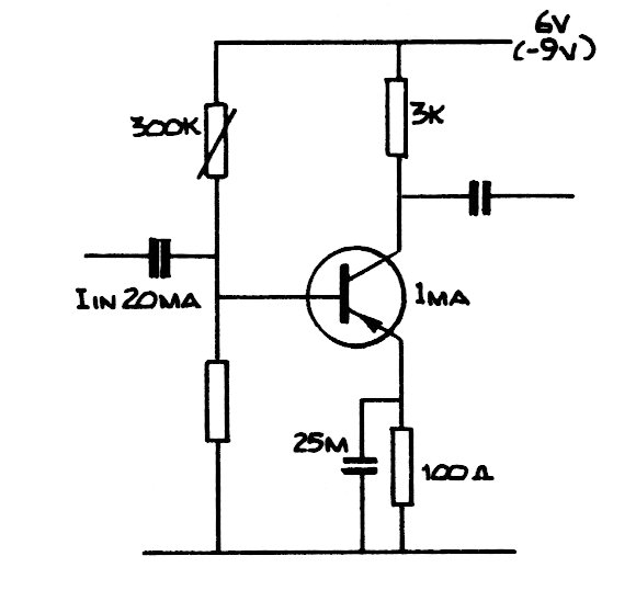 Esta etapa amplificadora con transistor de germanio como el AC108, AC173 u otros fue obtenida en una documentación de 1985. El circuito puede ser adaptado para usar transistores de silicio actuales.