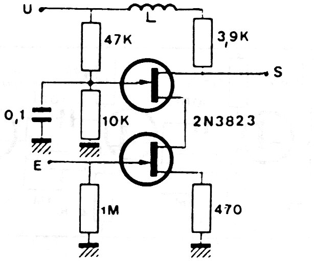 Este circuito está destinado a la amplificación de señales de vídeo analógico (vídeo compuesto) que se ha encontrado en una documentación de los años 80. El circuito utiliza FET de unión y tiene alimentación del orden de 15 V.