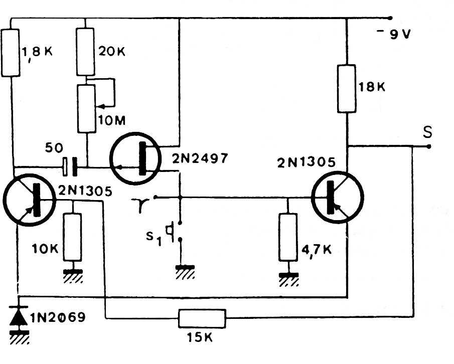 Encontramos este circuito en una documentación europea antigua. Se hace uso de JFET y transistores bipolares comunes que pueden ser reemplazados por equivalentes modernos. La alimentación se realiza con 9 V.