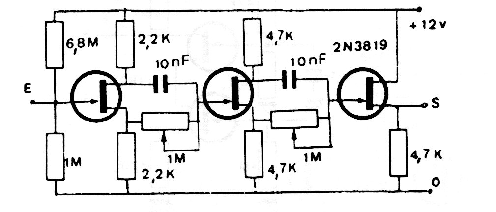 La finalidad de este circuito es cambiar la fase de una señal de pequeña intensidad aplicada a su entrada. El circuito puede utilizar prácticamente cualquier JFET como el BF245 y cambia la fase de 0 a 360 grados.