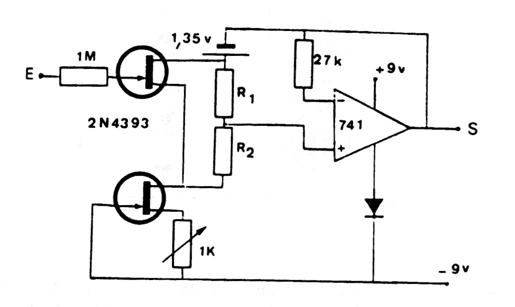 Este circuito es indicado para investigaciones biológicas donde la alta impedancia de entrada es fundamental para no afectar el espécimen analizado. El circuito de altísima resistencia de entrada excita un operacional que admite equivalente. Consulte la necesidad de una batería de polarización adicional. Los FET pueden ser los BF245.