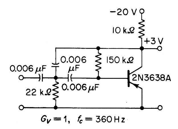 Este circuito se encontró en una documentación de 1968. El transistor puede ser el BC558 y la ganancia de tensión es la unidad. La frecuencia depende de los capacitores, que se pueden cambiar.