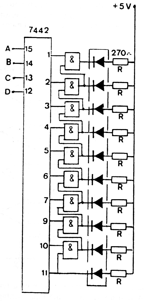 Este interesante circuito, que puede ser utilizado como shield, pues es TTL, hace que a partir de un comando lógico en la entrada, todos los LEDs que van desde cero al valor programado se encienden. La alimentación debe realizarse con 5 V y la resistencia R tiene un valor típico de 330 ohms.