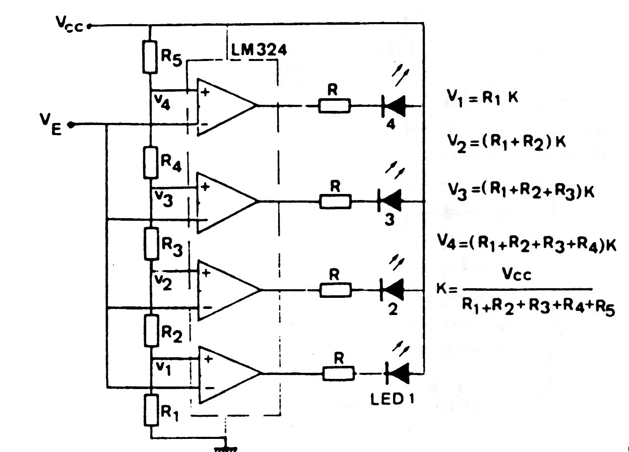 Este circuito se ha utilizado en muchas aplicaciones simples en las que se desea una escala de LED. Las fórmulas junto al diagrama se aplican en el cálculo de los componentes utilizados. R determina la corriente en los LED en función de la tensión de alimentación. Para 5 V utilice 330 ohms y para 12 V utilice 1 k.