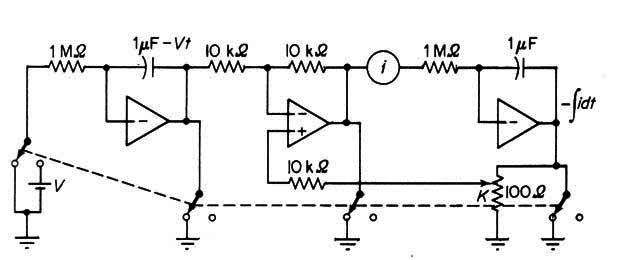 Este circuito es una computadora analógica convencional usando amplificadores operacionales. El indicador es un instrumento sensible y la alimentación depende del operacional utilizado. El circuito es de una documentación de 1968.