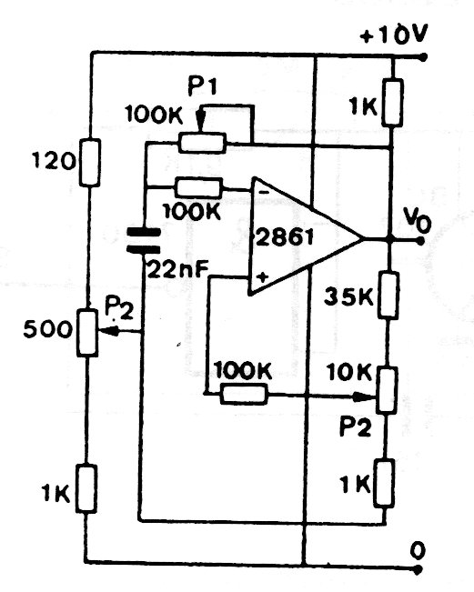 Este circuito utiliza un amplificador operacional poco común actualmente, pero puede ser implementado con equivalentes, incluso el 741. El circuito es de una documentación antigua no necesitando de fuente de alimentación simétrica.