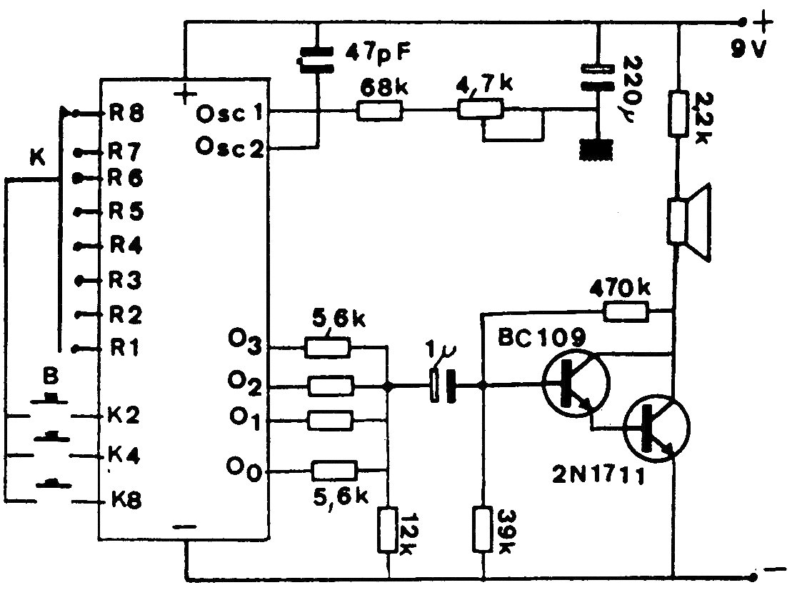 El circuito integrado TMS1000 de Texas Instruments fue de gran éxito en los años 80, consistente en un generador de melodías que ya contenía 8 melodías programadas que se seleccionaban a través de una llave selectora o de puentes. Los transistores de la etapa amplificadora admite equivalentes.