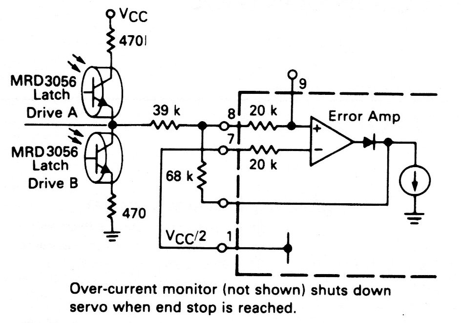 Este sistema óptico de control de servos de dos posiciones con traba fue encontrado en una documentación de los años 90. El amplificador de error puede ser un operacional y los sensores son foto-transistores.