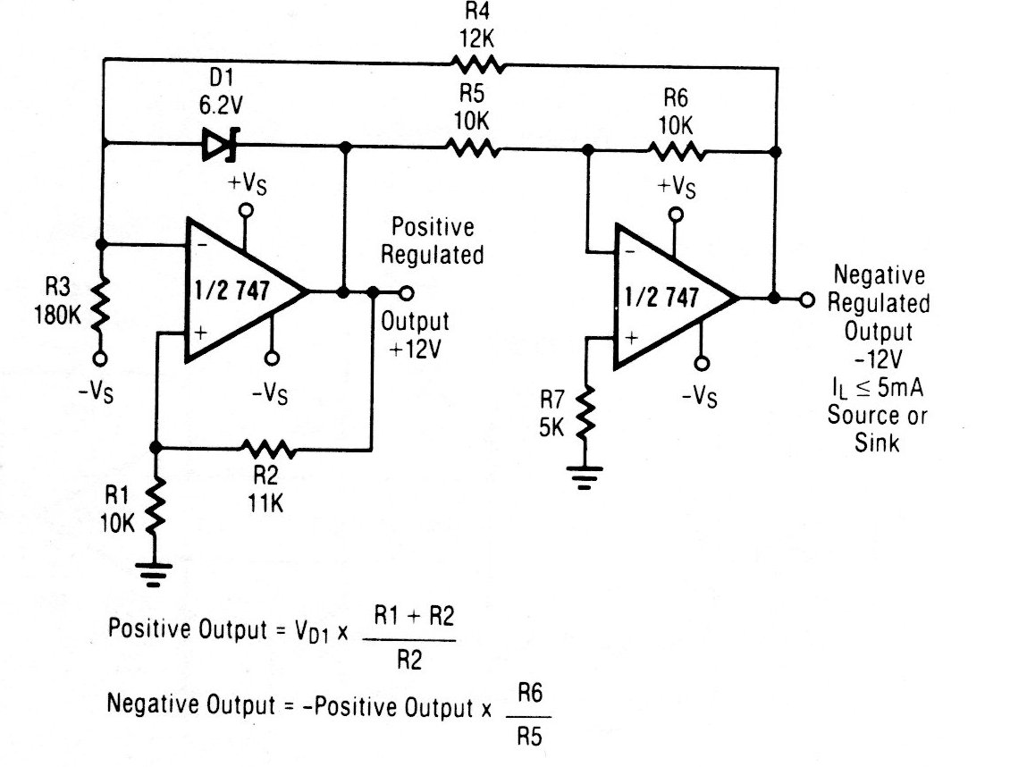 El operacional 747 utilizado en este circuito no es muy común actualmente, pero la configuración puede ser implementada con operacionales más modernos. El circuito es del datasheet del componente de los años 80.