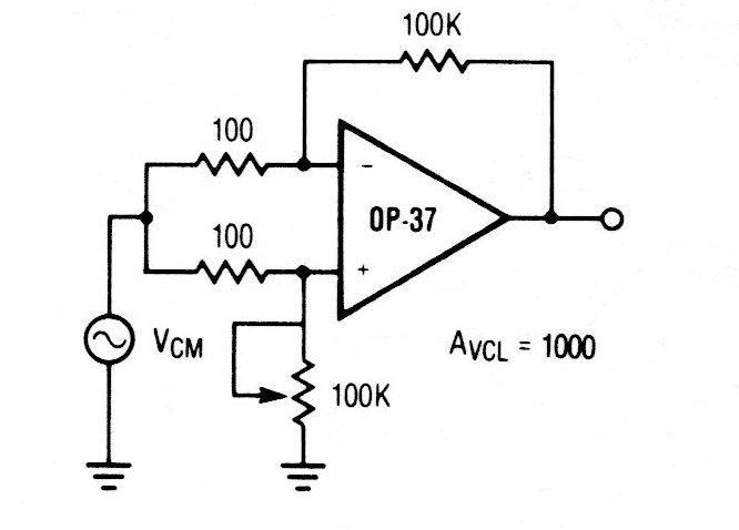 Con este circuito, de un datasheet de operacionales antiguo, es posible medir el CMRR, rechazo en modo común de un operacional. La fuente debe ser simétrica.
