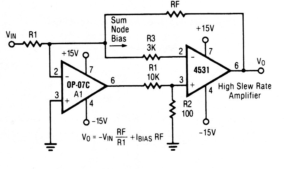 El operacional tomado como ejemplo es poco común actualmente, pero la configuración puede ser elaborada con tipos más modernos. La fórmula junto al diagrama proporciona las características del circuito en función de los componentes.