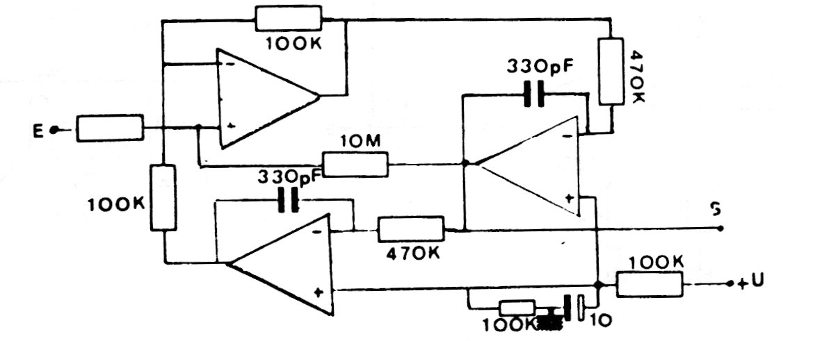 Este filtro tiene los componentes calculados para la frecuencia de 1 kHz, pero pueden ser alterados. La resistencia de entrada puede ser de 100k y la fuente simétrica. Cualquier operacional común puede ser utilizado.