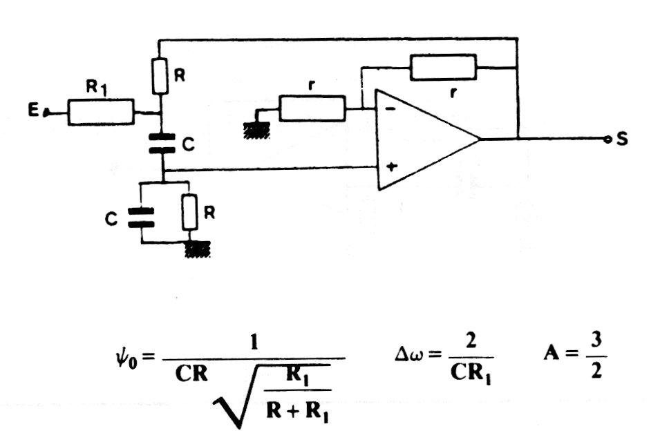 Este filtro tiene una configuración de fuente regulada. Se puede implementar con prácticamente cualquier amplificador operacional. Las fórmulas para el cálculo de los componentes se adjuntan al diagrama.