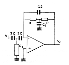 Los componentes de este filtro son calculados por las fórmulas convencionales (ver sección de matemáticas del sitio) y se puede implementar con prácticamente cualquier amplificador operacional como el 741. La fuente debe ser simétrica.