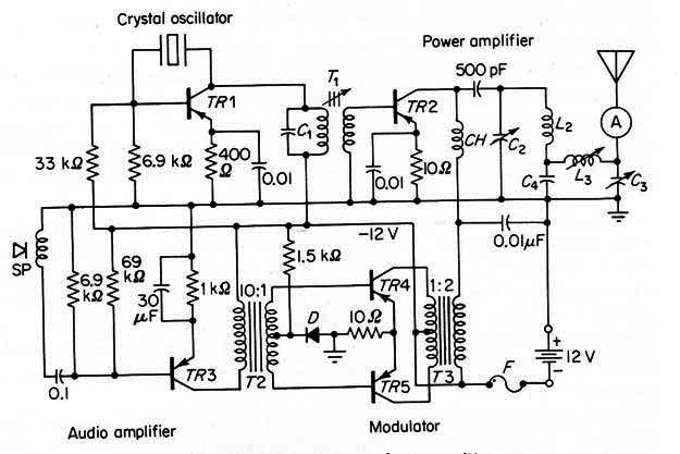 Encontramos este circuito con salida de clase C para la banda de AM en una publicación de los años 68. El circuito tiene un paso de audio en la modulación en push-pull y es alimentado por una tensión de 12 V y la frecuencia se determina por el cristal. Los transistores pueden ser de los tipos modernos de acuerdo con la función.