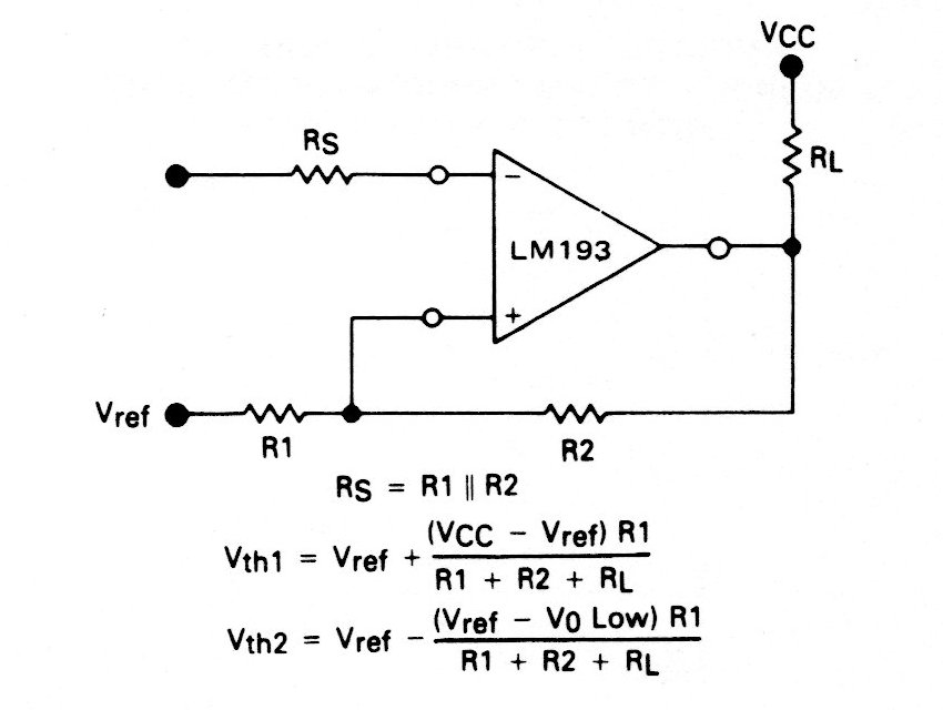 El operacional utilizado en este circuito no es muy común actualmente, pero la configuración es válida para tipos más modernos. Junto al diagrama se dan las fórmulas para cálculos de los componentes.