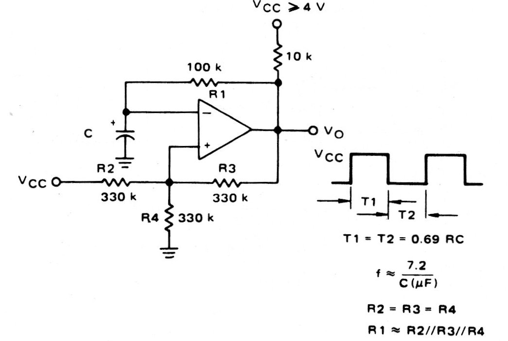 Este circuito, que aparece en otros puntos de este sitio, puede ser elaborado con cualquier comparador de la serie. La señal es rectangular y las fórmulas para el cálculo de los componentes se dan junto al diagrama. La fuente no necesita ser simétrica y puede ser hecha con tensiones de 4 a 12 V.