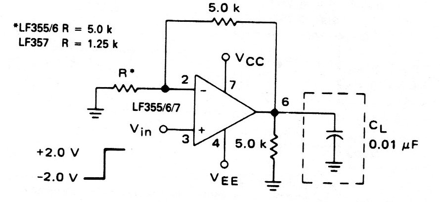 Este circuito fue retirado del propio manual del componente sirviendo para el LF355, LF356, LF357 y otros de la misma serie. La fuente debe ser simétrica y las características se dan junto al diagrama.