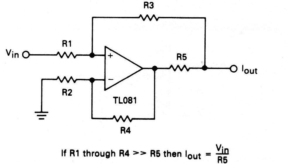 La corriente de salida de este circuito está controlada por la tensión aplicada a la entrada. Se puede utilizar una etapa de amplificación para corrientes mayores. El circuito es del propio manual del componente.
