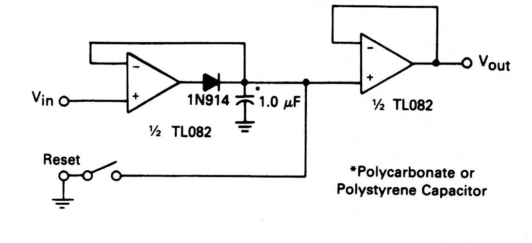 Este circuito se obtuvo en el propio manual del componente. El capacitor debe ser de alta calidad con bajas fugas y la fuente de alimentación debe ser simétrica. El diodo es de uso general.