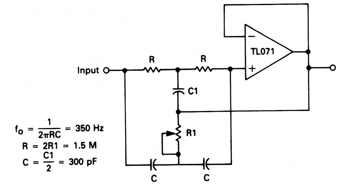 El amplificador operacional utilizado tiene FET en la entrada y la fuente de alimentación debe ser simétrica. El circuito se obtuvo del propio manual del componente. Las fórmulas para calcular los componentes se dan junto al diagrama.