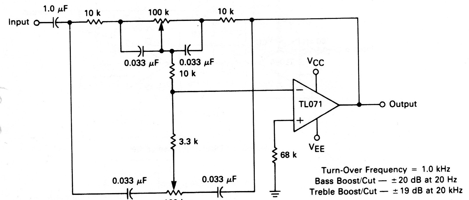 Este circuito se obtuvo en el propio manual del componente. Para una versión estéreo utilice el TL072 que es la versión doble del componente. La fuente debe ser simétrica y los cables de señal deben ser blindados.
