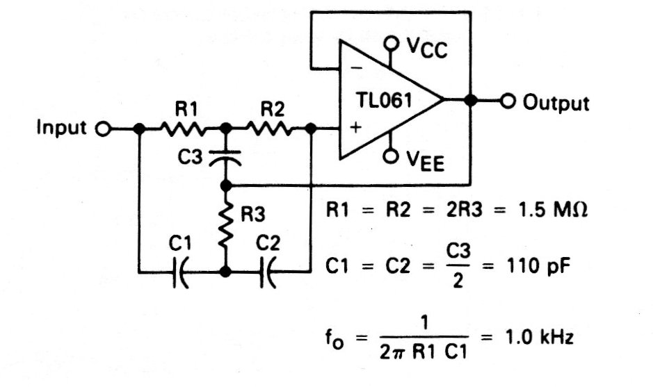 Los circuitos integrados equivalentes doble y cuádruple de la misma serie se pueden utilizar en este filtro de 1 kHz. El circuito es del manual del propio componente y las fórmulas para los cálculos de los componentes se dan junto al diagrama.