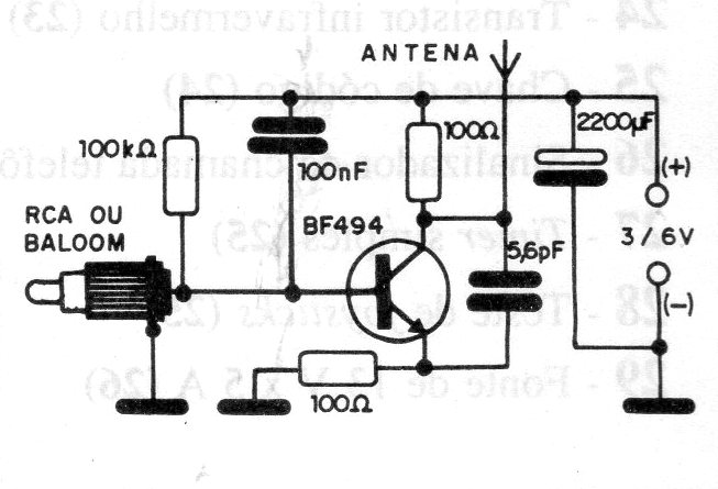 Encontramos este ultra simple circuito de transmisor que nada más es que una etapa de potencia de RF de muy corto alcance y sin frecuencia sintonizada. El circuito irradia señales de videocintas y reproductores de CD para televisores analógicos cercanos. El circuito es de una documentación de 1995.