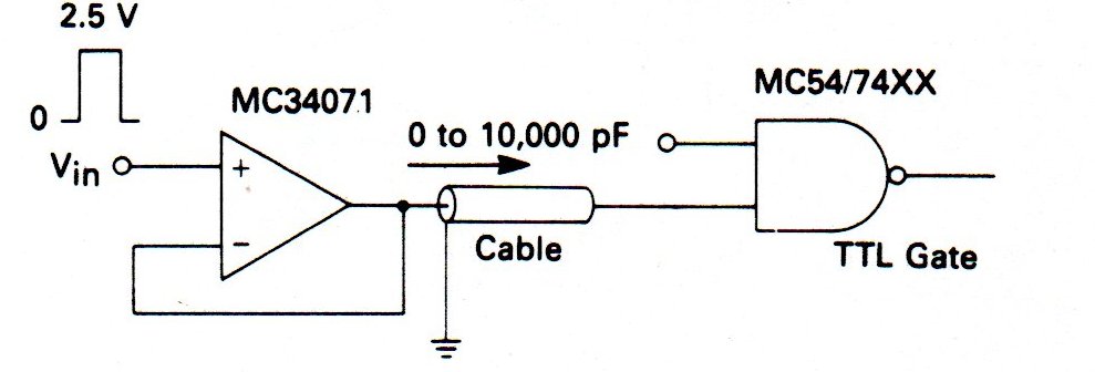 Este circuito, que se puede utilizar como shield es un buffer con ganancia unitaria compatible con la lógica TTL. El circuito está indicado para la transmisión de señales por cable y hace uso del MC34071 de Motorola. El circuito se obtuvo en el manual del propio componente.