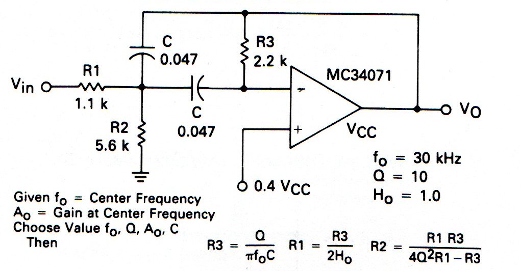 Este filtro centralizado en 30 kHz fue sugerido por Motorola en el manual del circuito integrado utilizado que es de los años 90. El circuito vale para amplificadores más modernos y las fórmulas para cálculos de los componentes según la frecuencia se dan. La ganancia es 10.