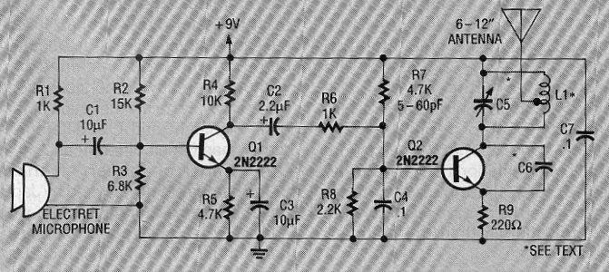 Este artículo salió en una Radio Electronics de noviembre de 1991. La revista ya no existe, pero el circuito puede ser montado con facilidad. La antena tiene de 15 a 30 cm y la bobina L1 está formada por 4 espiras de cable 26 AWG sin forma con de diámetro de 1 cm. C5 es un trimmer común de 10 a 30 pF de capacidad máxima. El circuito tanto puede funcionar con 4 pilas como una batería de 9 V. Los capacitores de menos de 1 uF deben ser cerámicos.