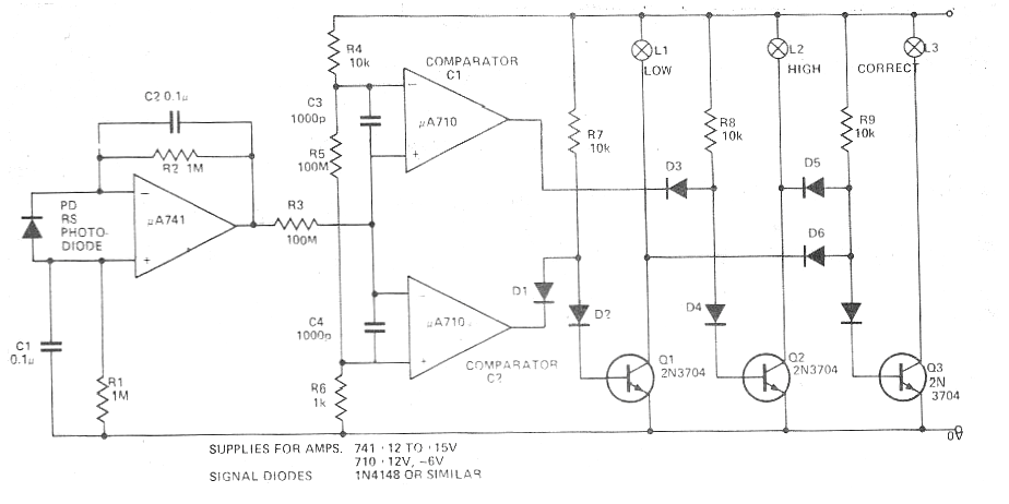 Este circuito salió en una revista inglesa que ya no existe en su versión impresa. La edición fue de julio de 1976 y como todos los componentes son comunes, excepto el uA710 que puede ser reemplazado por un LM339, el proyecto es perfectamente viable en nuestros días. Los transistores pueden ser los BC548 y las lámparas de 6 x 50 mA según la alimentación utilizada. El sensor es un foto-diodo común. El 741 debe ser alimentado por fuente 12 V y el comparador con tensión de + 6 V.