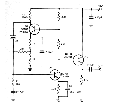 Hemos encontrado este circuito en una publicación inglesa denominada Electronic Circuit Design en el n3 de la primavera de 1980. Este circuito puede operar con cristales de 50 kHz a 150 kHz y los transistores admite muchos equivalentes como los 2N2222, BC548, BC547, BF494 y muchos otros. Los capacitores deben ser cerámicos.
